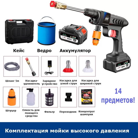 Ручная мойка высокого давления с удобным кейсом для транспортировки и переноски работает от аккумулятора 24в.