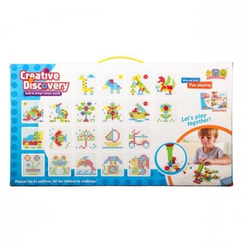 Большой конструктор мозаика Creative Discovery — мечта маленького конструктора. 310 ярких деталей различных форм, с которыми так интересно играть. При помощи отвертки и шурупов у ребенка получится собрать машинку, растение, животное, какой-либо домик. Хранить набор можно в коробке. Ее крышка имеет перфорацию. На ней можно крепить фигуры вертикально, создавая объемные конструкции.