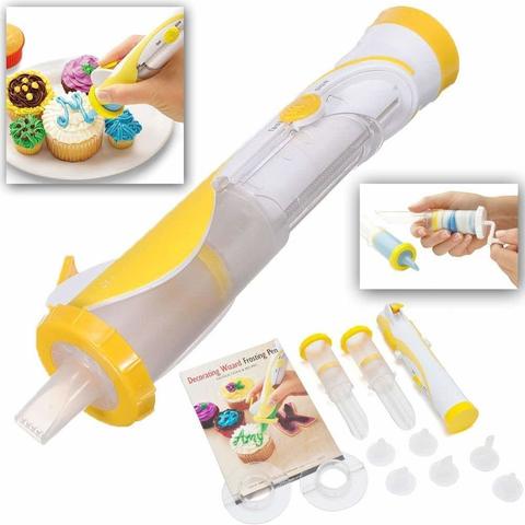 Электрошприц для украшения тортов Frosting Deco Pen Вы любите проявлять фантазию на кухне? Тогда электрошприц для украшения тортов Frosting Deco Pen – для вас. С его помощью можно приготовить настоящие кулинарные шедевры, украшенные кремовыми цветами или звездочками. В комплект включены шесть разных насадок и три контейнера для крема. Для того чтобы начать работу по украшению торта, необходимо наполнить контейнер кремом, выбрать необходимую насадку и нажать на желтый рычаг. Электрошприц легко скользит по коржам, создавая чудесные завитки и розочки. Электрошприц работает на двух скоростях, что очень удобно и для начинающего кулинара, и для профи. Добавьте цвет и сладость большим торжествам и маленьким повседневным моментам! Ваш новый кондитерский шприц сделает это гораздо проще, чем когда-либо прежде. Он создан для того, чтобы помочь вам создать красивые украшения - на покупных хлебобулочных изделиях и на самодельной выпечке - в считанные минуты. Им очень удобно работать: узор легко наносится, как пером. Просто надавите на желтый рычаг и глазурь начнет выдавливаться на двух скоростях - быстро или медленно. В комплект входят : 6 насадок разных типов для украшения (круглый, треугольный,звездочка,овал и т.д.). 3 контейнера для крема. Работает от двух батареек АА, которые не входят в комплект.