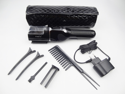 4. Комплектация. В комплект каждого прибора Fasiz входят специальная расческа для разделения прядей, два зажима, адаптер для зарядки и щеточка для чистки машинки. и удобная сумочка для хранения.