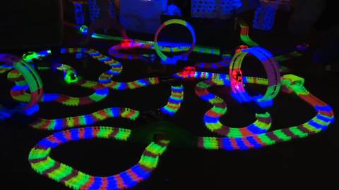 Соберите гибкую гоночную дорогу, прокладывая ее под кроватью или вокруг стола. Делайте разноцветные дороги, невообразимые виражи, мосты или даже колеса. А когда выключится свет, погрузитесь в сказочный мир.