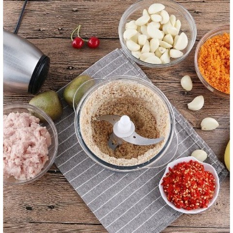 Работает от сети (розетки на 220 В). Несмотря на компактные размеры, объем чаши составляет 1,8 литра. Этого хватает для ингредиентов любого блюда на семью из 4-5 человек (суп, салат, мясные кушанья). Высота прибора – 23 см, он легко помещается на кухонную полку и не требует разбора.