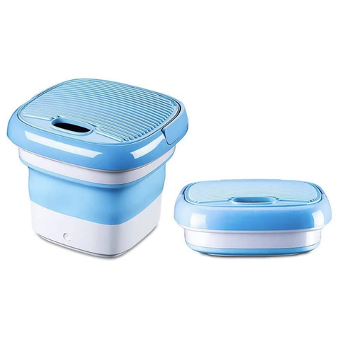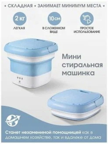 Мини стиральная машина - это устройство для стирки, которое представляет собой складное ведро с электромотором, предназначенное для удаления легких загрязнений с одежды. В разложенном виде ведро для стирки имеет объем 8 литров. Переносная машинка для стирки упростит вам жизнь, а также сэкономит пространство в маленькой квартире, общежитии, кемпинговом или дачном домике. Она станет незаменимой помощницей вдалеке от привычных бытовых условий. Стиральная машина-ведро стирает до 0,8 кг. белья за один раз, а длительность ее цикла составляет всего 15 минут. Она может заменить ручную стирку мелких вещей, нижнего белья, носков, детской одежды. Портативная машинка занимает минимум места, поэтому легко поместится в дорожную сумку и чемодан. Чтобы запустить стирку необходимо сложить вещи в машинку, залить горячую воду, добавить порошок, включить в сеть и нажать кнопку.