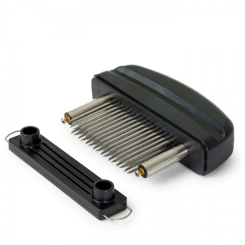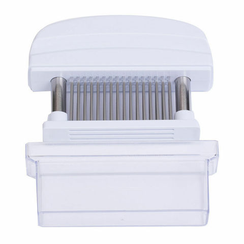 Тендерайзер ручной для нарезки свинины, телятины, баранины, рыбы и др. продуктов. Сокращает время работы на 40%. Конструкция из пластика с 16 лезвиями  из нержавеющей стали. В комплект входит пластиковая крышка. Обработка тендерайзером мяса первого сорта позволяет приобрести ему мягкость высшего, а второго сорта - готовить из него антрекоты и ромштексы. Лезвия быстро и легко моются и чистятся.