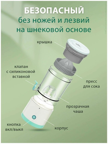 Портативная мини соковыжималка подходит для всех типов фруктов. Аппарат полностью портативный, заряжается от USB шнура что позволяет использовать в любом месте и в любое время. Аппарат полностью безопасный без ножей и лезвий на шнековой основе. Беспроводная портативная соковыжималка, высокий выход сока, без остатка и без отходов.